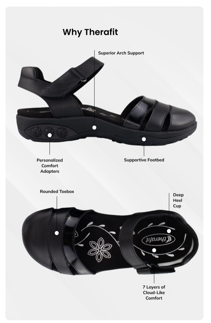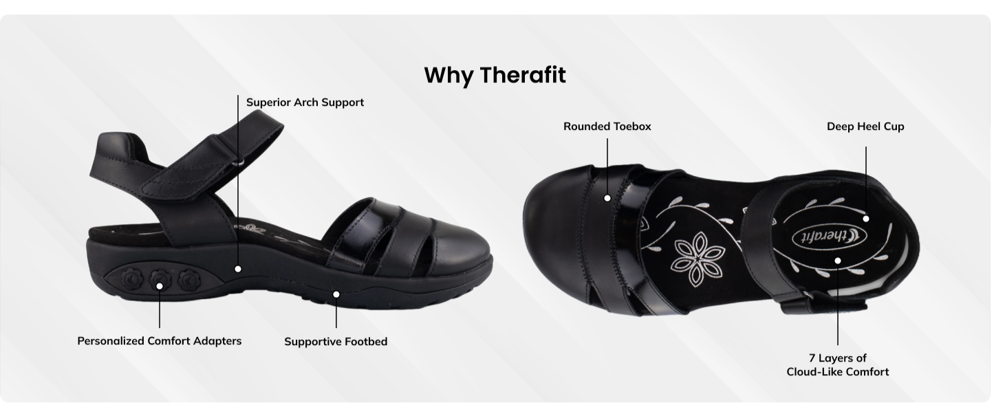 Therafit’s contoured footbed, superior arch support, and deep heel-cups will stabilize and support your foot. Therafit Footwear products are designed for optimal support and cushioning with the goal of providing you with reliable comfort, protection and relief from arch pain, heel pain, plantar fasciitis, pronation and other foot pain symptoms.