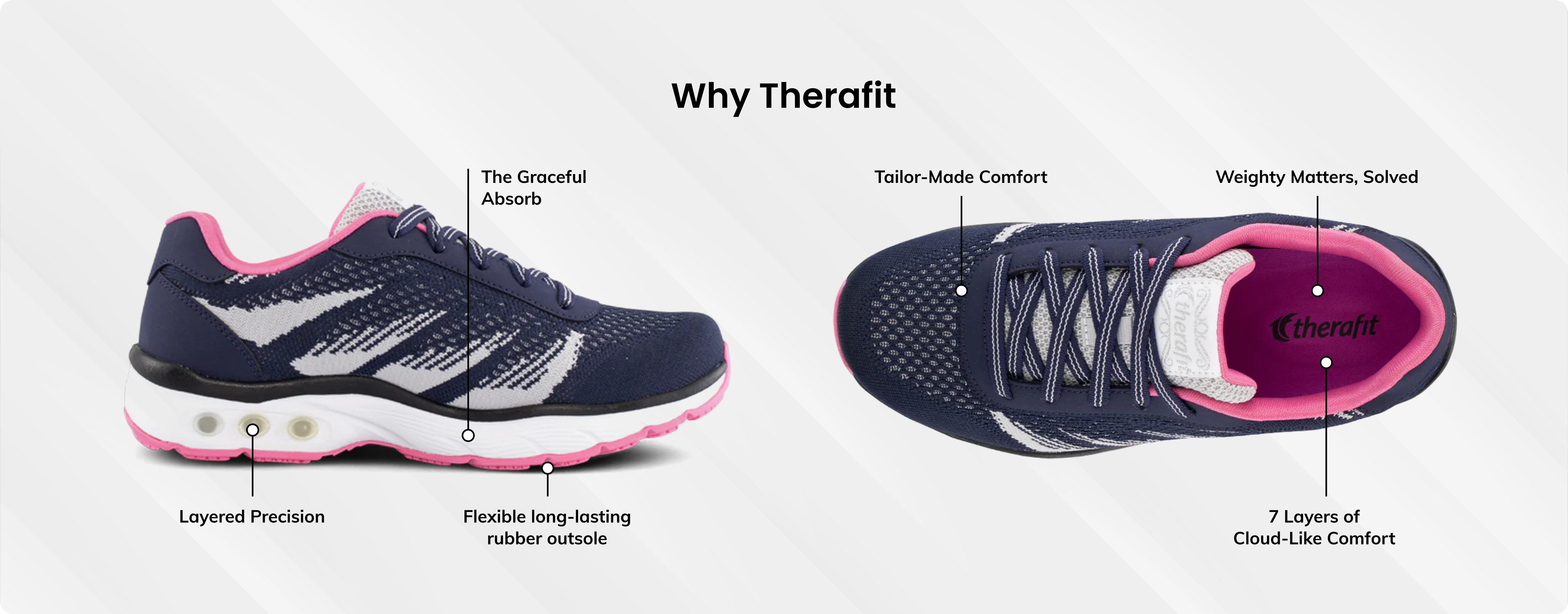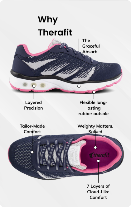 Therafit’s patented technology helps relieve stress on your lower body with the goal to improve posture, increase support and reduce pain. Therafit Footwear products are designed for optimal support and cushioning with the goal of providing you with reliable comfort, protection, and relief from arch pain, heel pain, plantar fasciitis, pronation, and other foot pain symptoms.