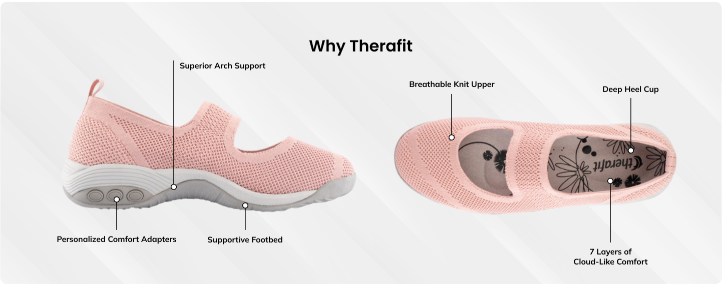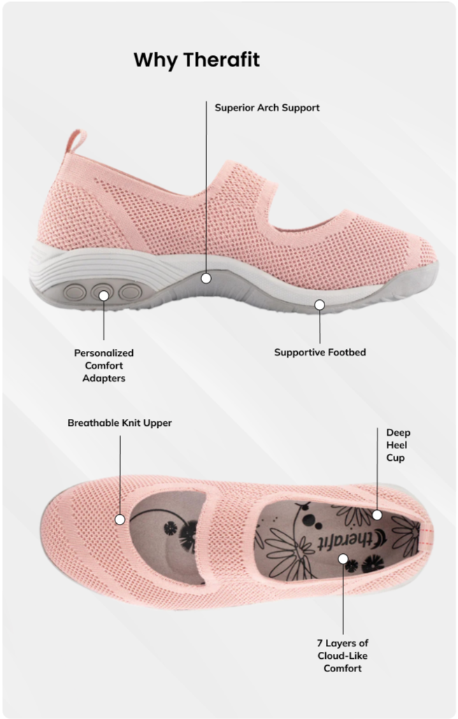 The contoured footbeds, superior arch supports, and deep heel-cups will stabilize and support your foot during those daytime outings and evening strolls. Therafit Footwear products are designed for optimal support and cushioning with the goal of providing you with reliable comfort, protection and relief from arch pain, heel pain, plantar fasciitis, pronation and other foot pain symptoms.