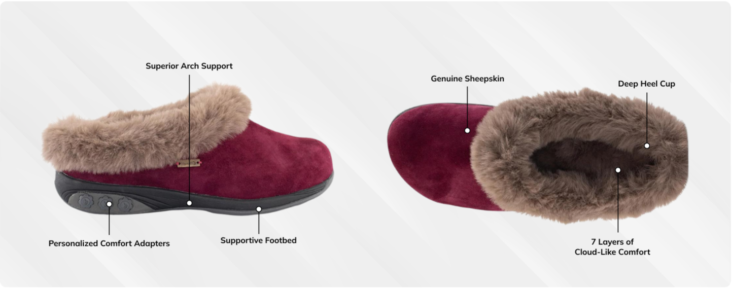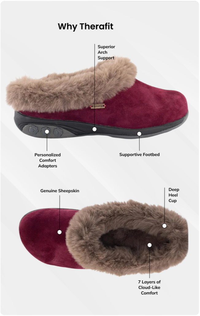 Therafit Scarlett slipper is designed for optimal support and cushioning with the goal of providing you with reliable comfort, protection and relief from arch pain, heel pain, plantar fasciitis, pronation and other foot pain symptoms.