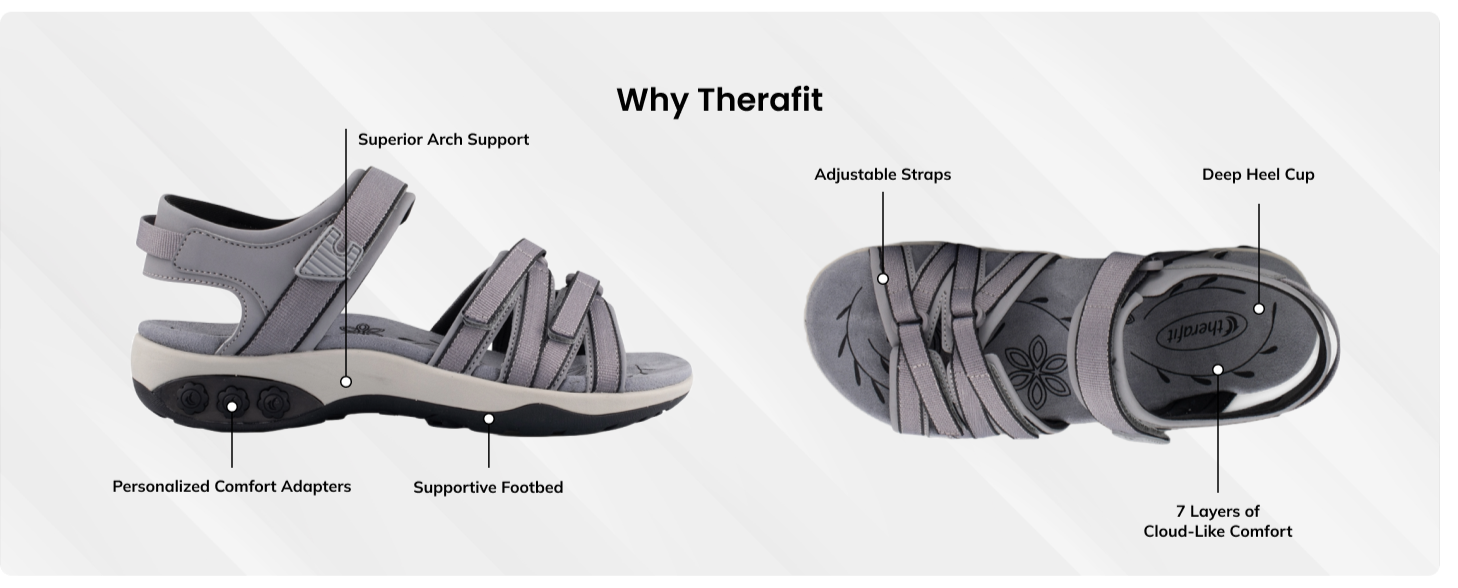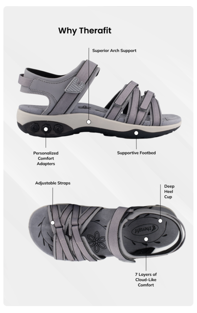 Therafit’s contoured footbed, superior arch support, and deep heel-cups will stabilize and support your foot. Therafit Footwear products are designed for optimal support and cushioning with the goal of providing you with reliable comfort, protection and relief from arch pain, heel pain, plantar fasciitis, pronation and other foot pain symptoms.