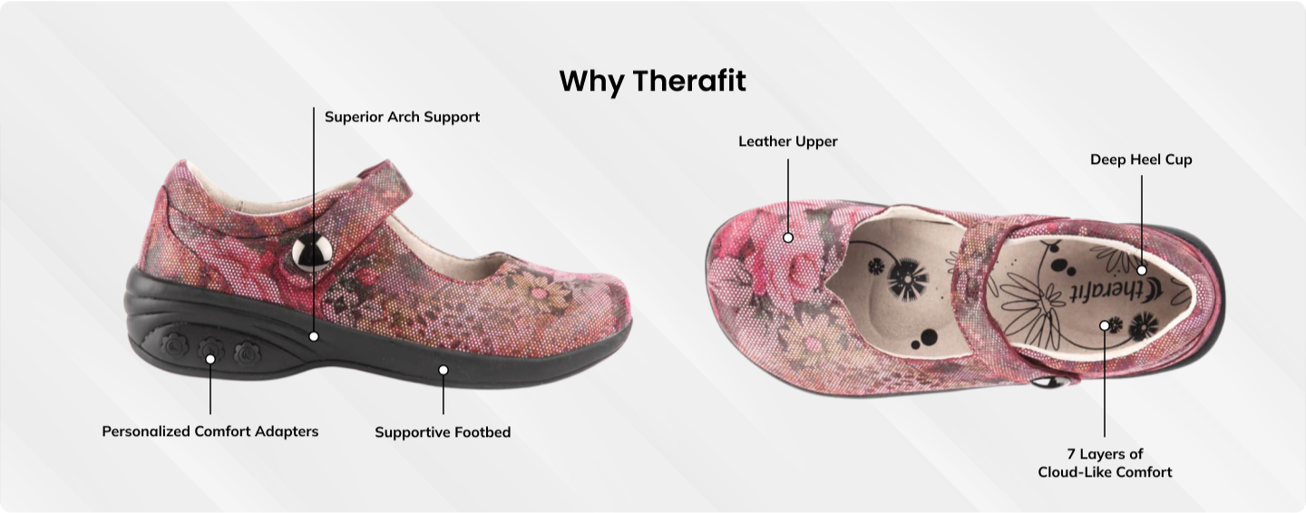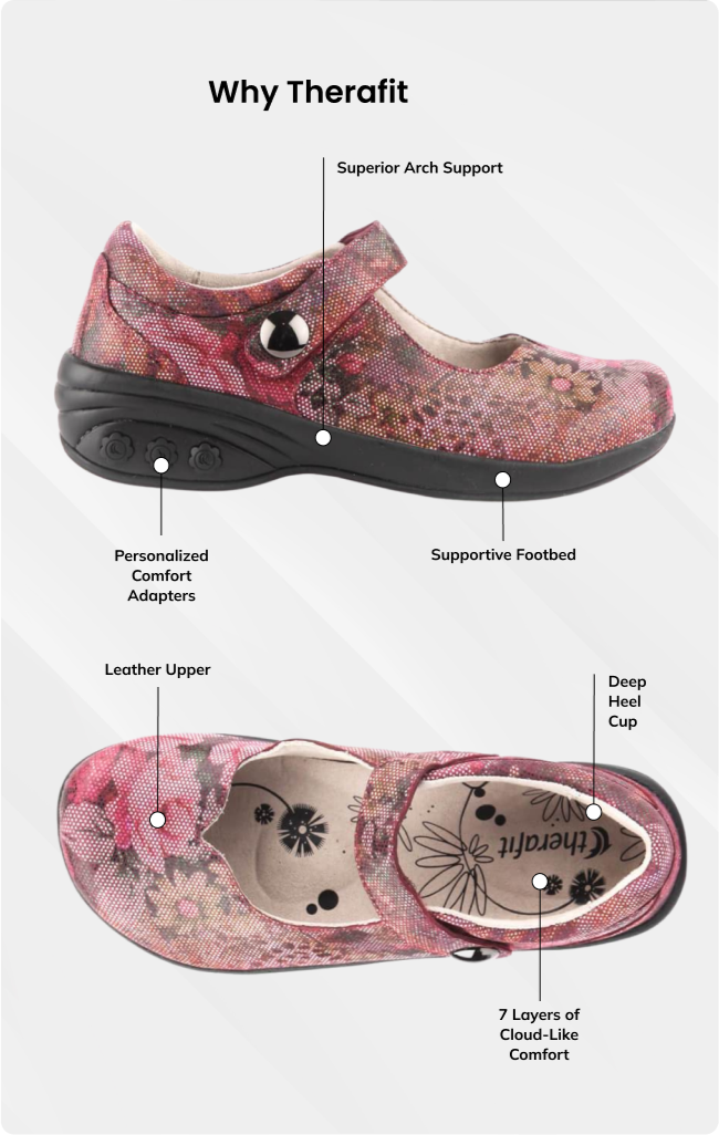 Therafit Melissa is designed for optimal support and cushioning with the goal of providing you with reliable comfort, protection and relief from arch pain, heel pain, plantar fasciitis, pronation and other foot pain symptoms.
